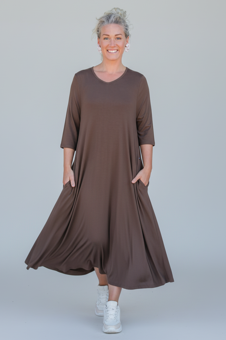 En Ballerina V-Neck Long är en modern klassiker med både stil och komfort! Klänningen är tillverkad i mjuk, skön viskos vilket ger en stretchig passform som omfamnar kroppen utan att strama åt. Ballerina har härlig tyngd i tyget och med fickor.