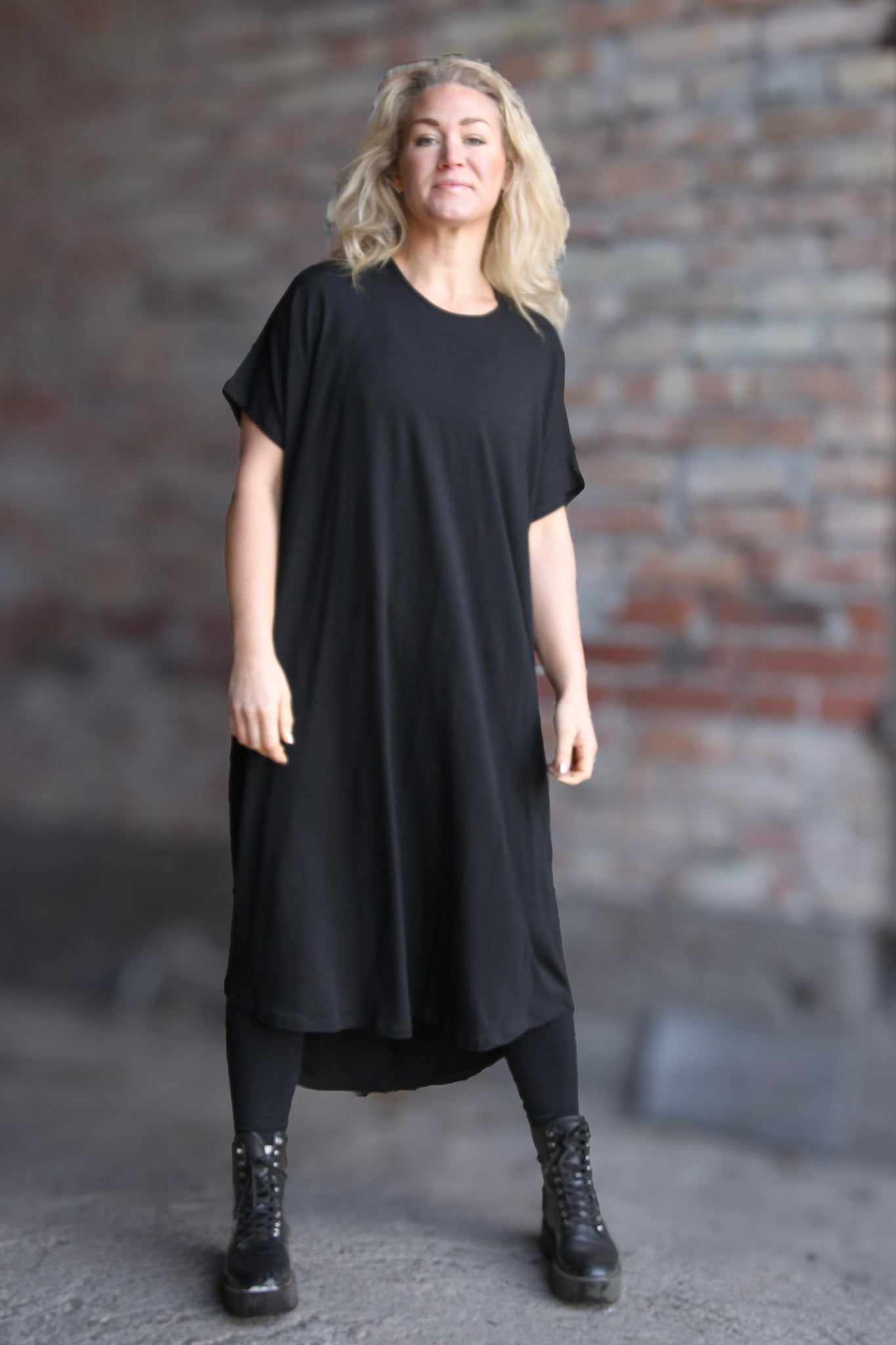 Svart Klänning Eveline Dress Black är en fantastiskt skön och stilren klänning i stretchigt ribbat material med ett vackert fall. Den har en avslappnad passform med vida ärmar, U-ringning och en elegant knappöppning i nacken.