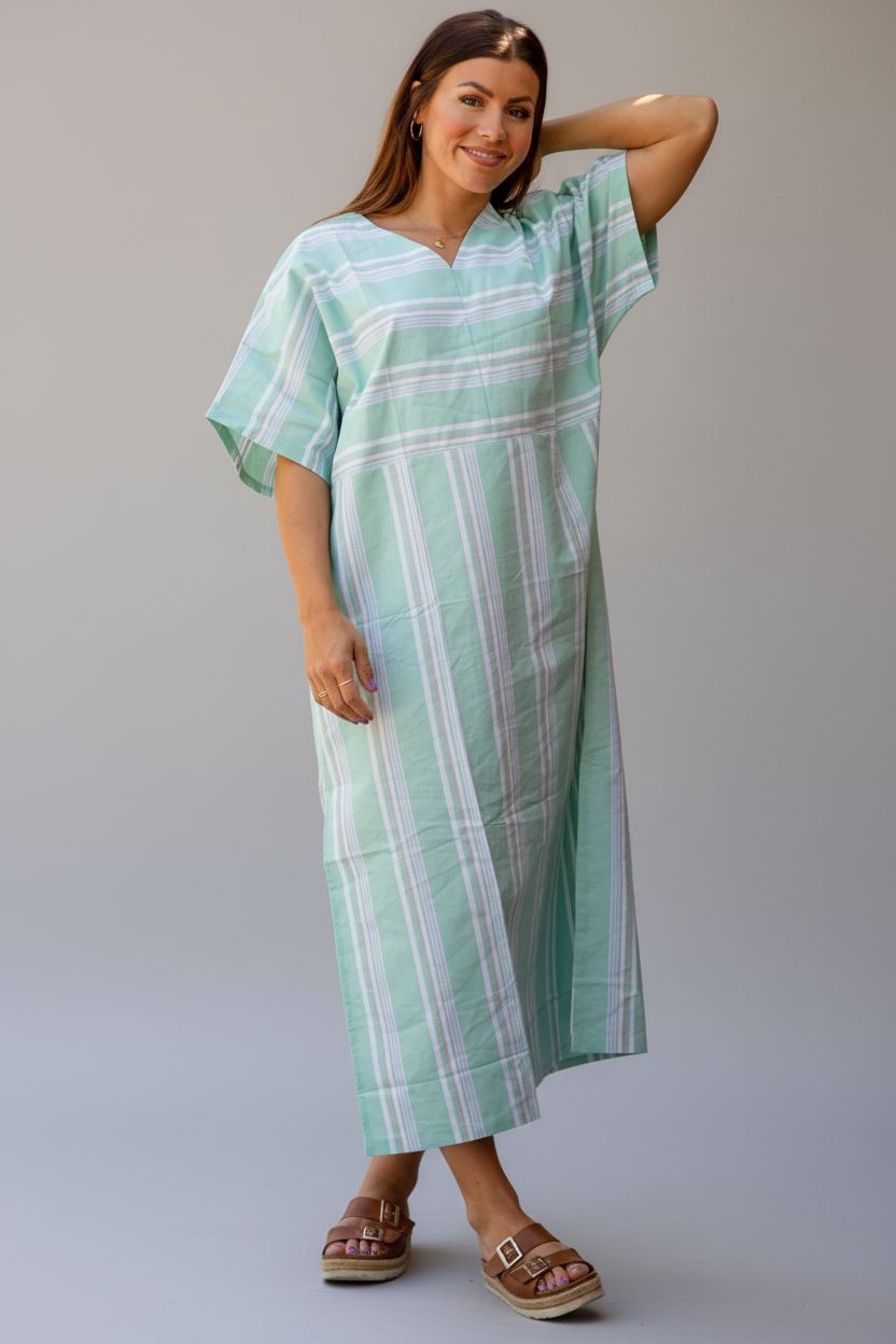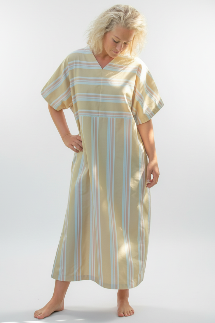 Behagelig stribet kjole i 100% sprød og behagelig bomuld. En drømmekjole til at tage på og slentre rundt på landet eller i byen.