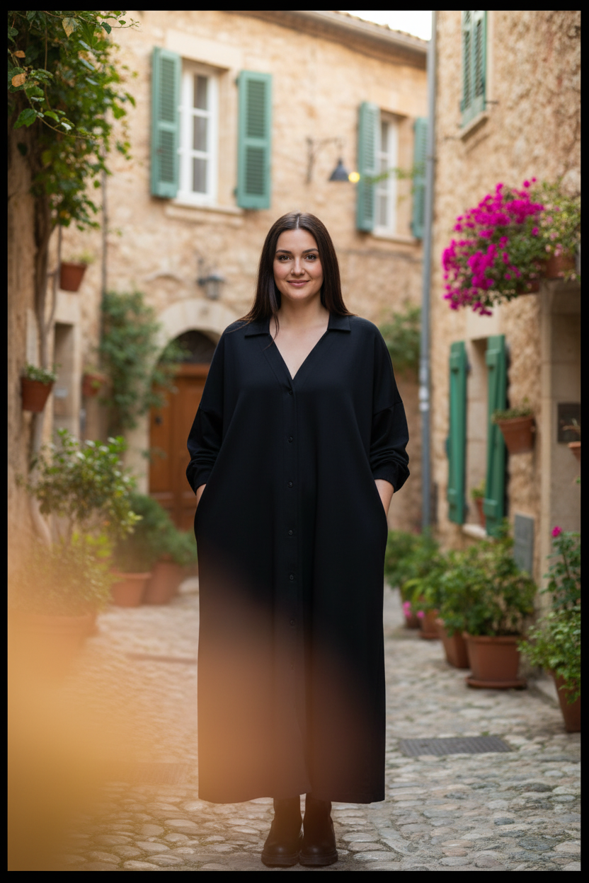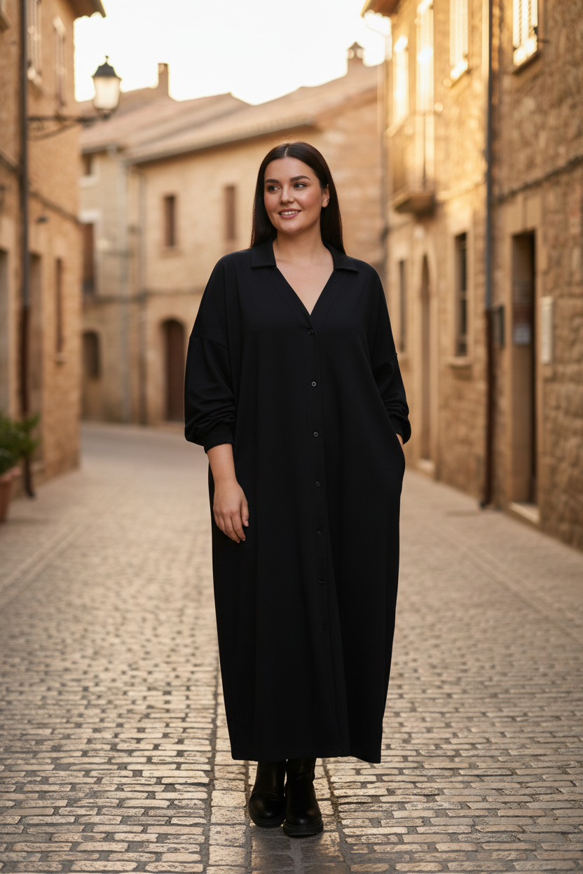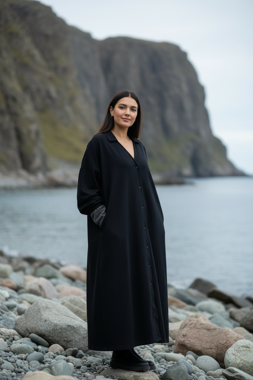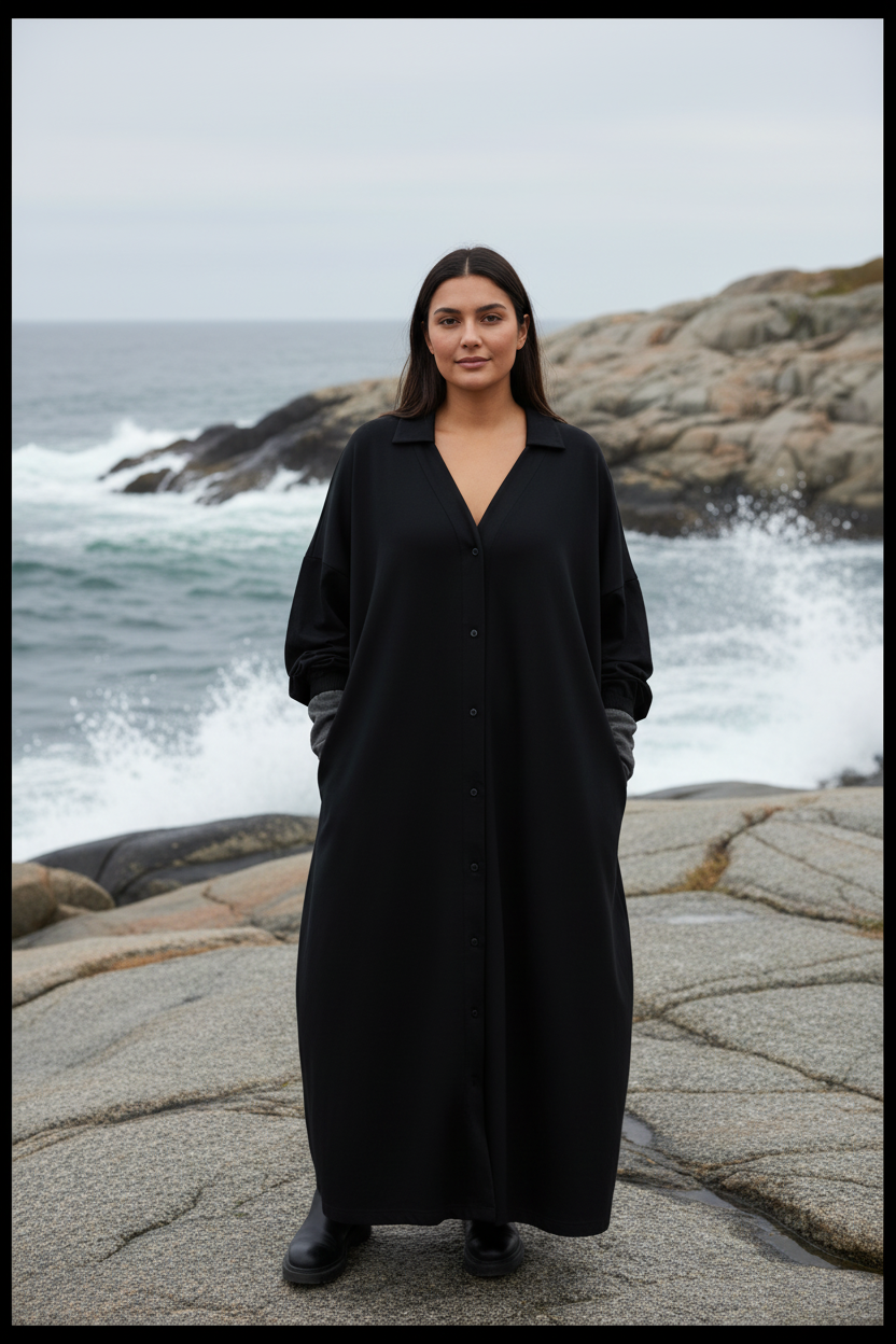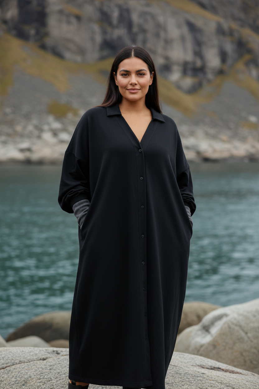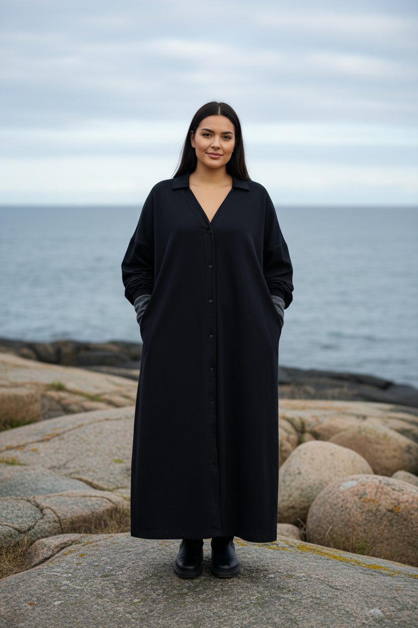Sahara COTTON är klänning som är designad i klassisk A-modell med modern funktion så som fickor. Den har knappar hela vägen ned, vilket gör det enkelt att bära den både stängd och användas som en klänning eller öppen som en luftig överdel.