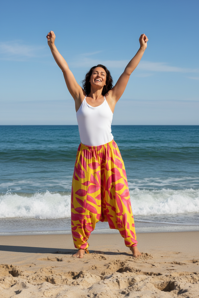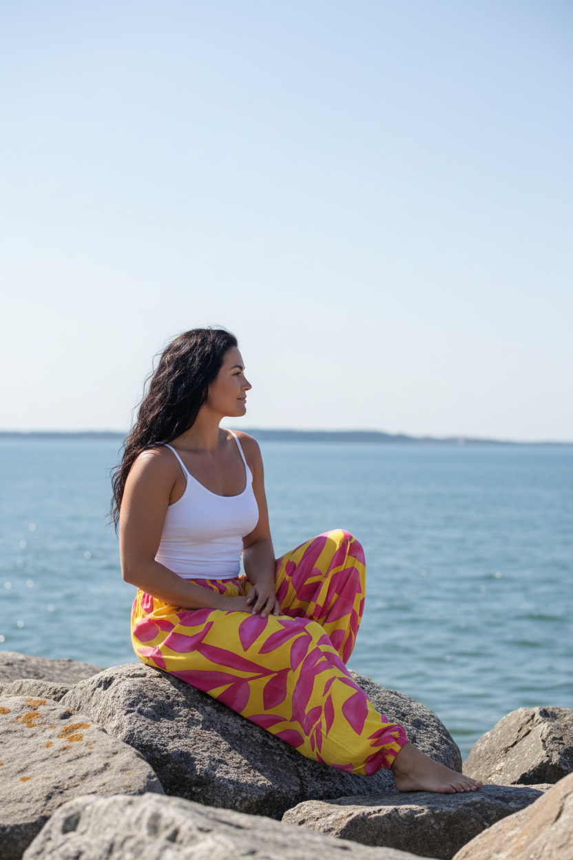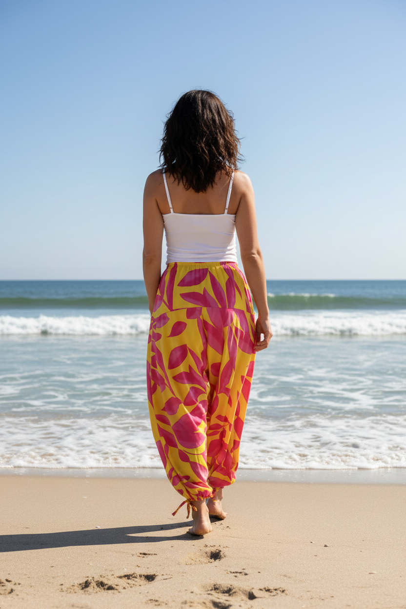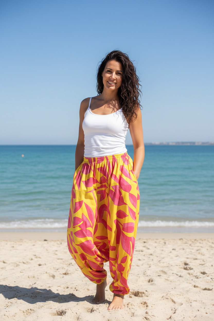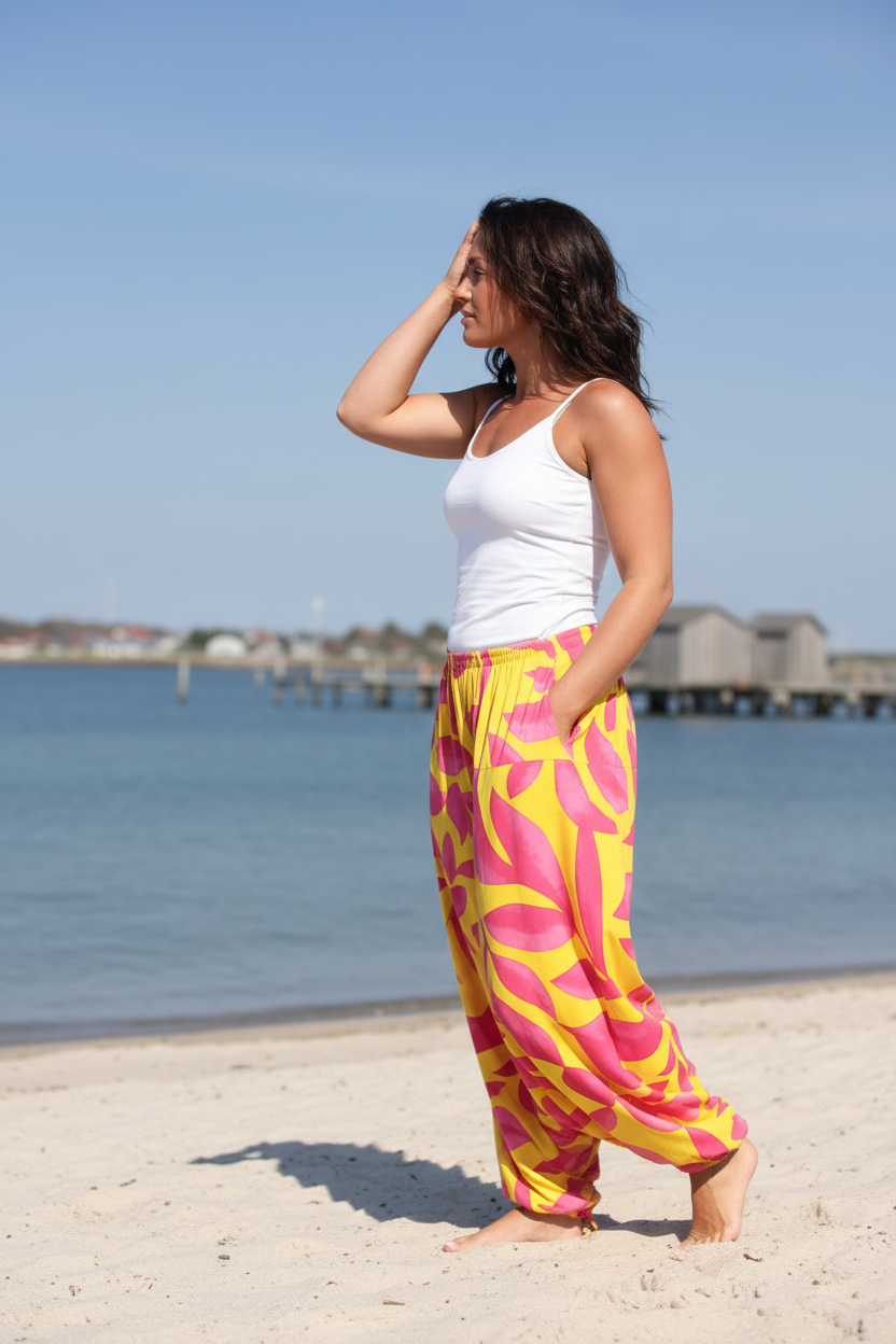 Gul/Rosa Mönstrad Haremsbyxa Classic Yellow Base Pink Leafs