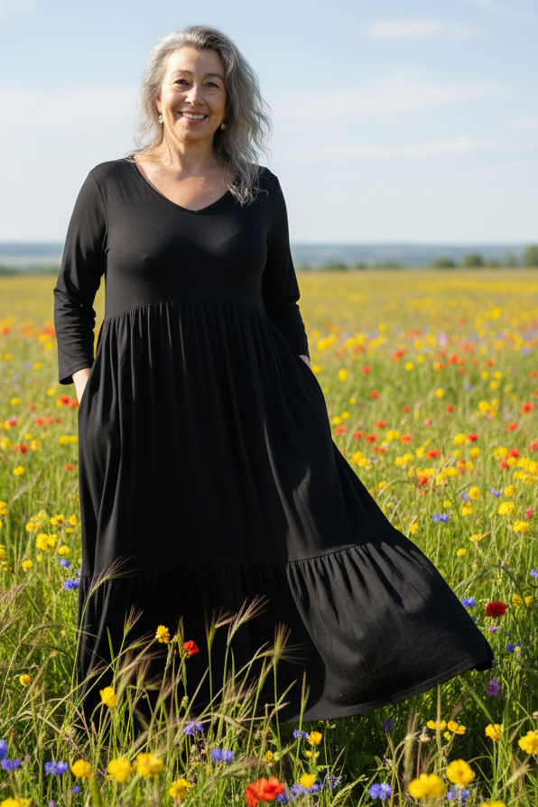 En härlig klänning i superstretchigt material och supergenerös design med fickor och 3/4 ärm. Vi skulle vilja påstå att den passar alla. Draperad och med otroligt vackert fall!